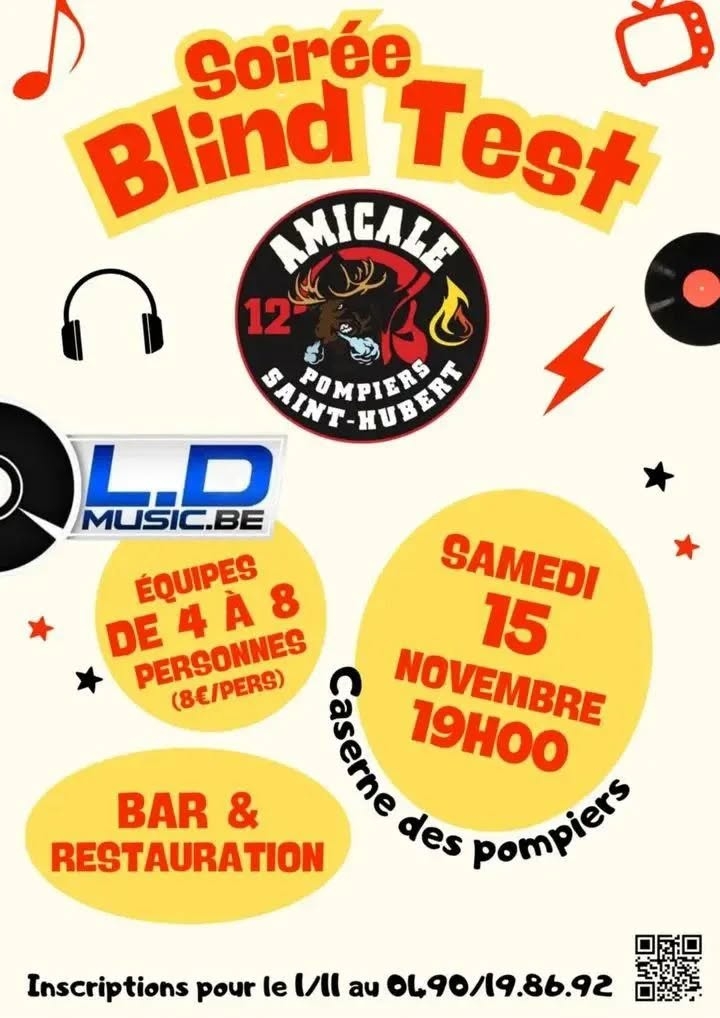 L’Amicale des Pompiers de Saint-Hubert vous donne rendez-vous le samedi 15 novembre à 19h00 à la caserne des pompiers pour une soirée Blind Test animée par L.D Music.