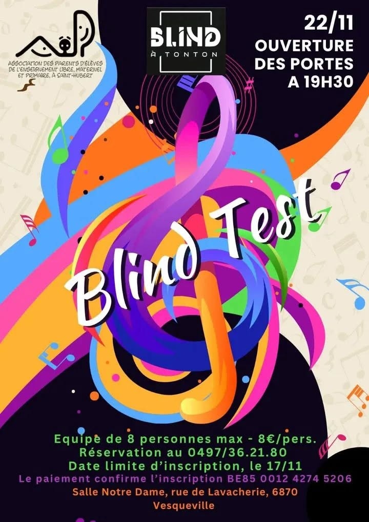 L’Association des Parents d’élèves de l’enseignement libre maternel et primaire de Saint-Hubert organise son Blind Test le vendredi 22 novembre à la salle Notre-Dame (rue de Lavacherie, à Vesqueville).