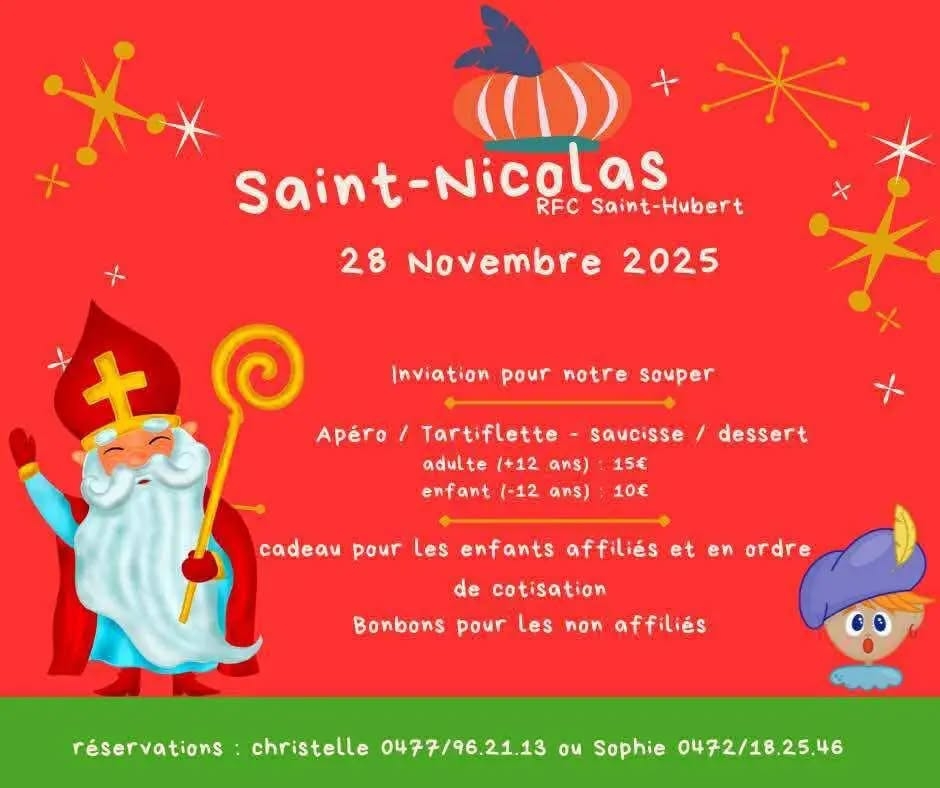 Le RFC (Royal Football Club) Saint-Hubert invite petits et grands à fêter la Saint-Nicolas le vendredi 28 novembre 2025 lors d’un souper convivial à la buvette du club.